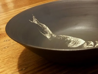 It started in the form of a birthday present, a beautiful print from someone I didn't know drew, and a conversation about the linocut process with it's commonalities to sgraffito. Well... one thing led to another... and a collaboration has begun.